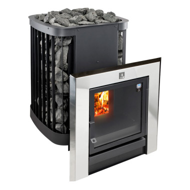 Дровяная печь-каменка черного цвета, эмалированная. Объем парилки: 8-20 м3