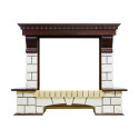 Модель представлена в нескольких вариантах, различающихся как по принципу установки (угловой или пристенный), так и цветовым решением облицовочного камня и деревянных элементов. Декорирована резными вставками в античном стиле.