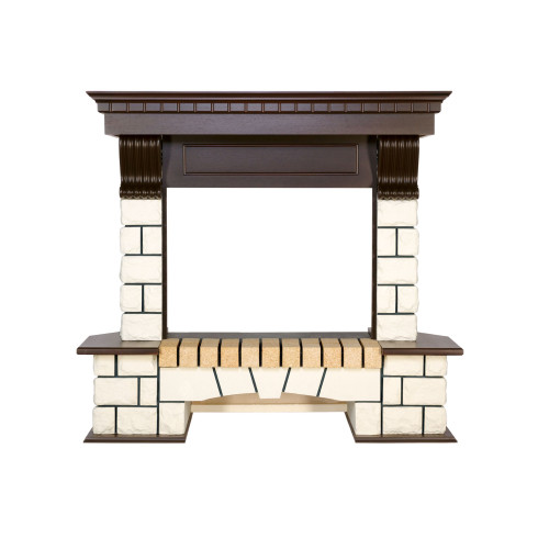 Модель представлена в нескольких вариантах, различающихся как по принципу установки (угловой или пристенный), так и цветовым решением облицовочного камня и деревянных элементов. Декорирована резными вставками в античном стиле.