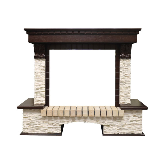 Модель представлена в нескольких вариантах, различающихся как по принципу установки (угловой или пристенный), так и цветовым решением облицовочного камня и деревянных элементов. Декорирована резными вставками в античном стиле.